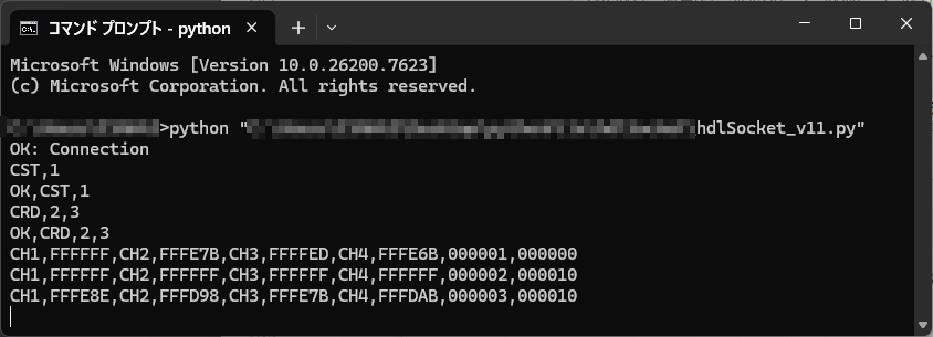 - ターミナルでhdlSocket_v11.pyを実行すると、プログラム内で指定したホスト・ポートに接続を試みます。