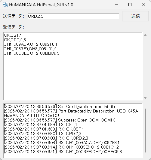 - 上記の実行例では、シリアル通信開始後に送信データに「CST,1」を入力し、送信ボタンを押してデータを送信しています。(「CST」はUSB-045Aの接続確認コマンド)